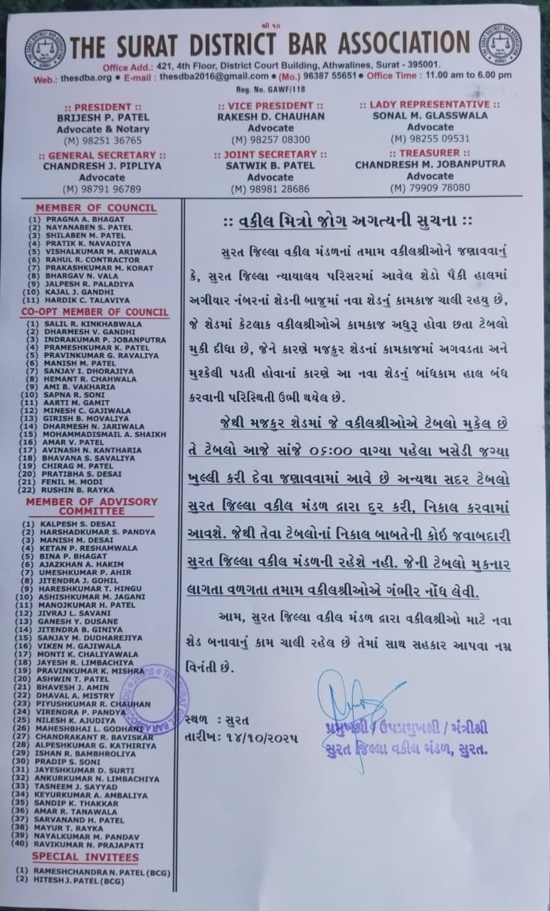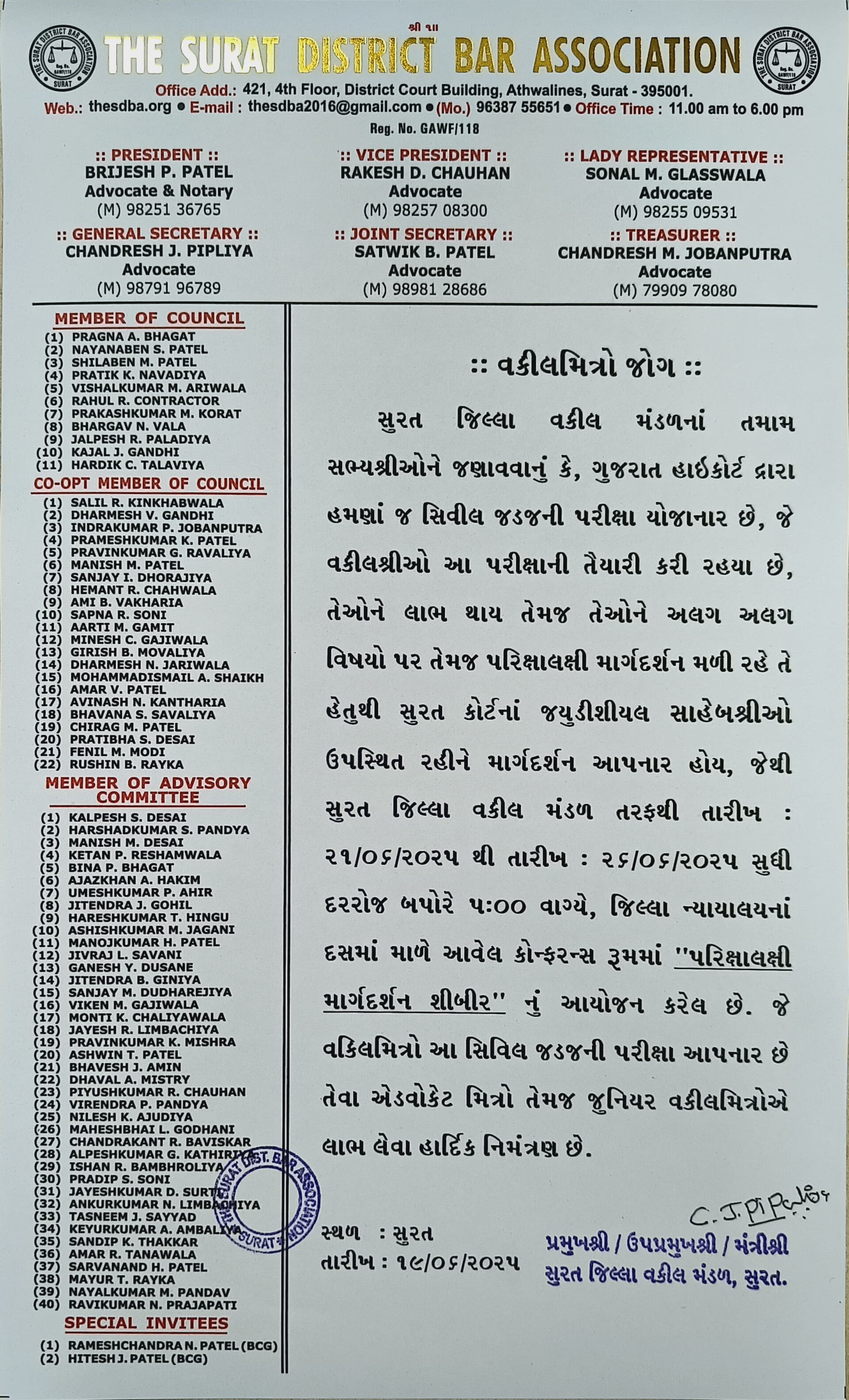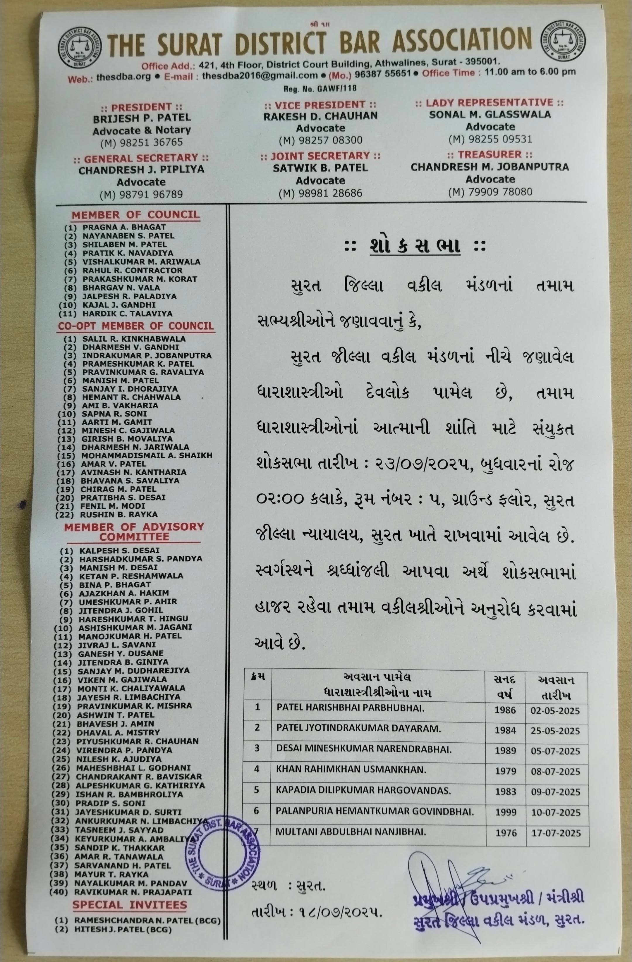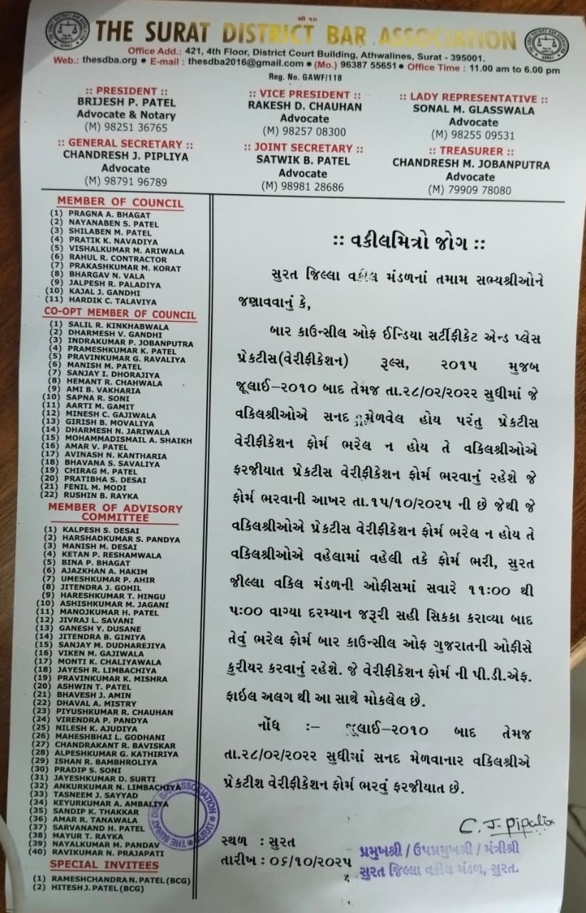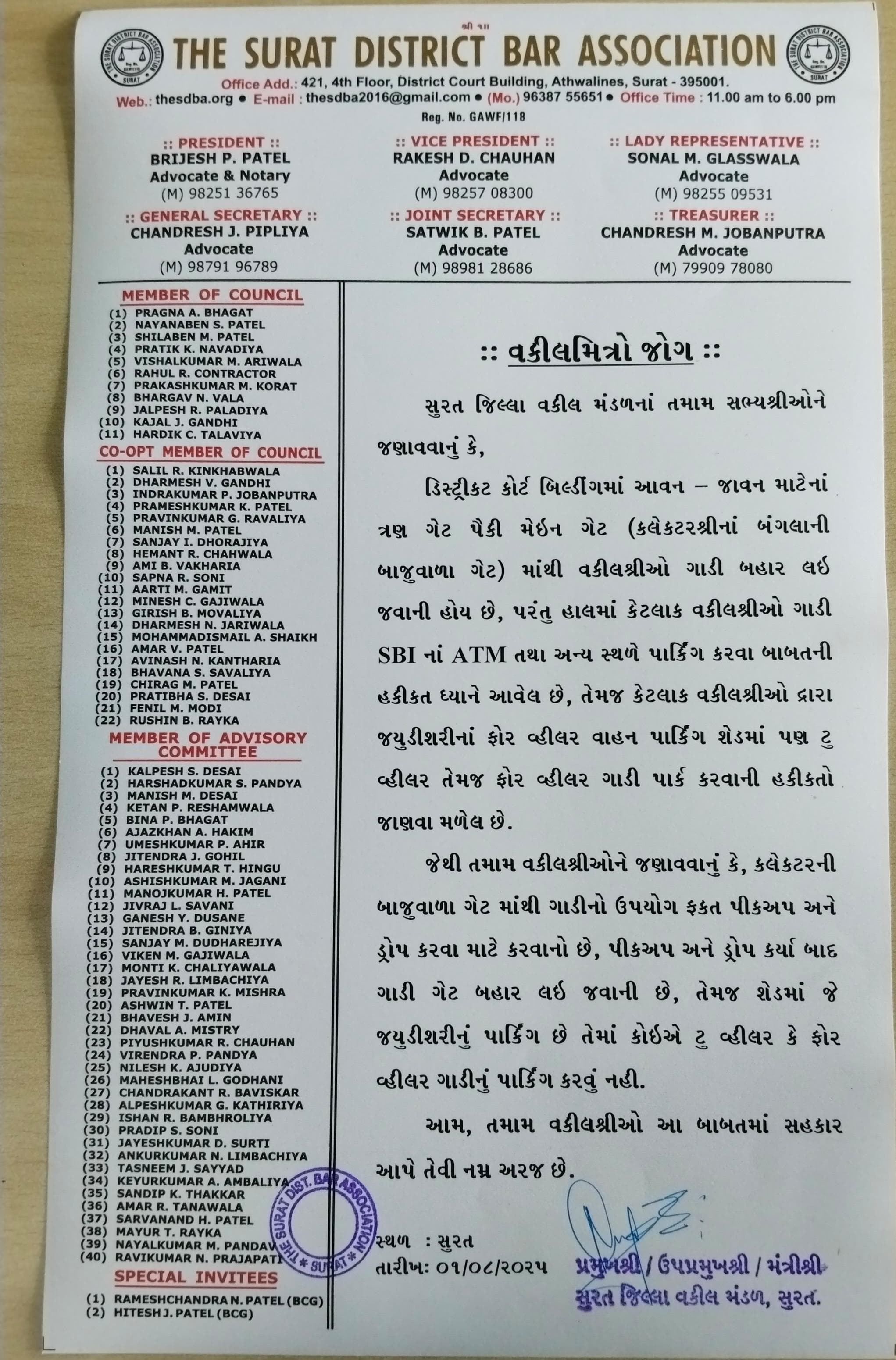 સુરત જિલ્લા વકીલ મંડળનાં તમામ વકીલશ્રીઓને જણાવવાનુંકે,