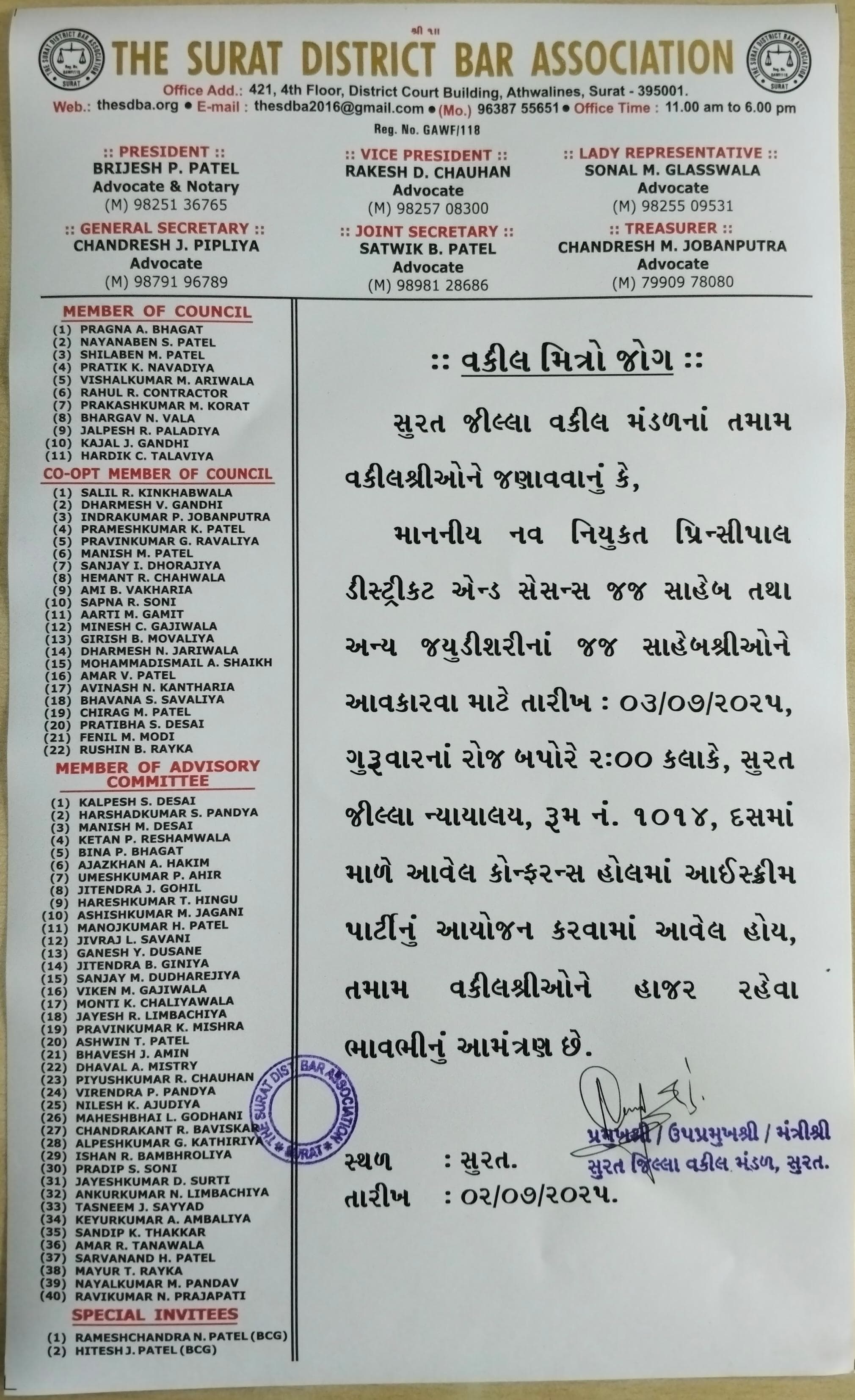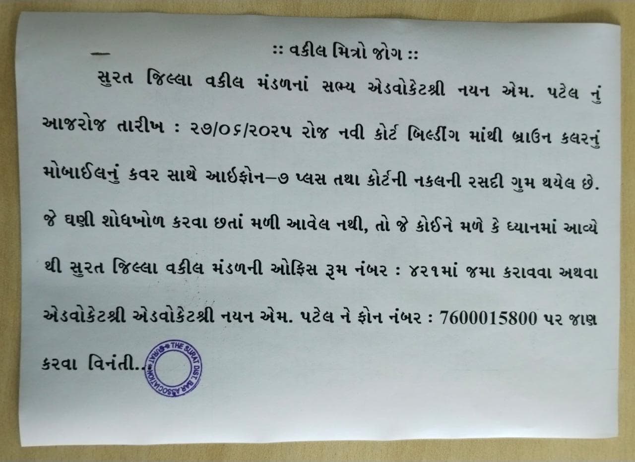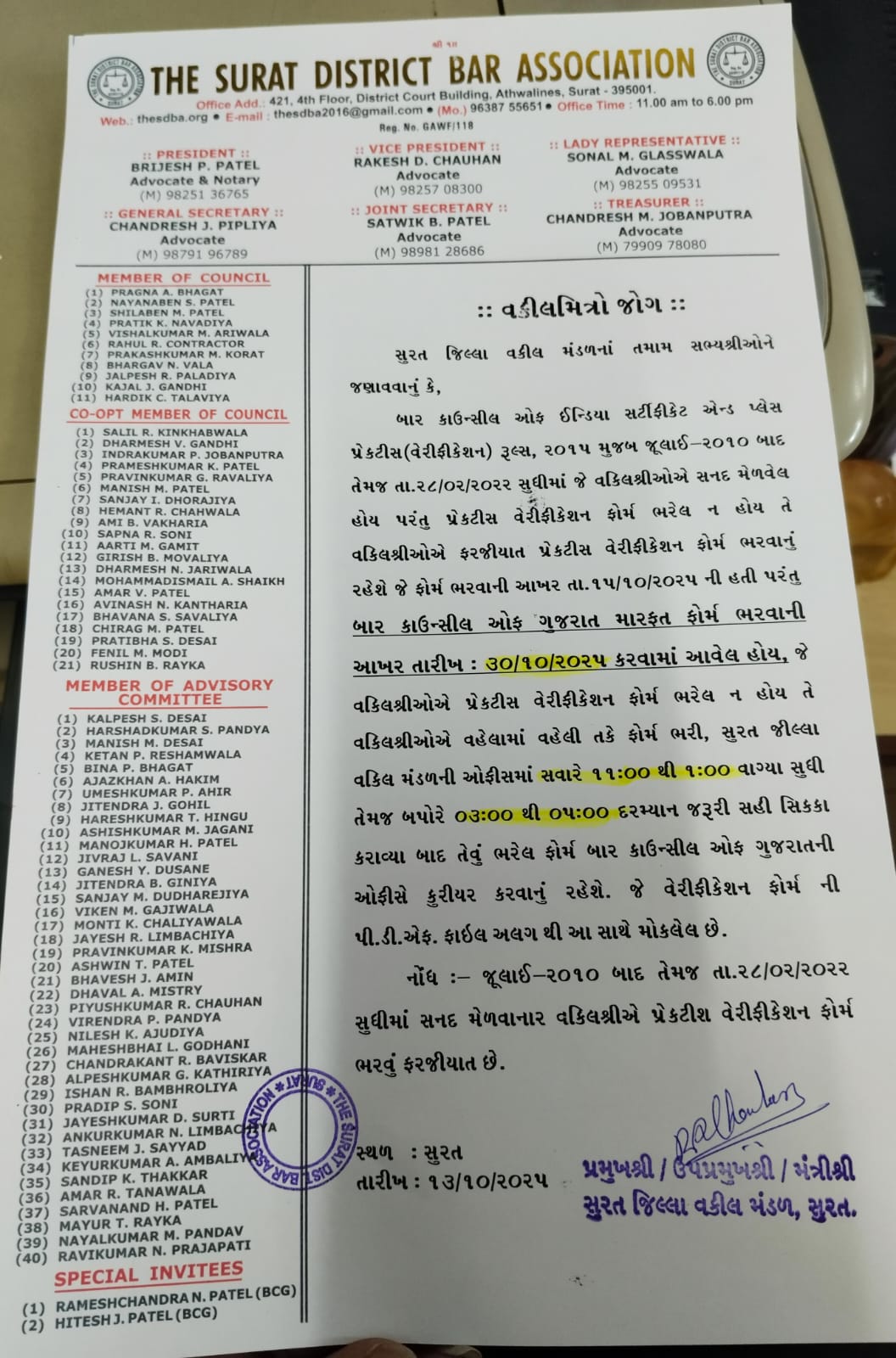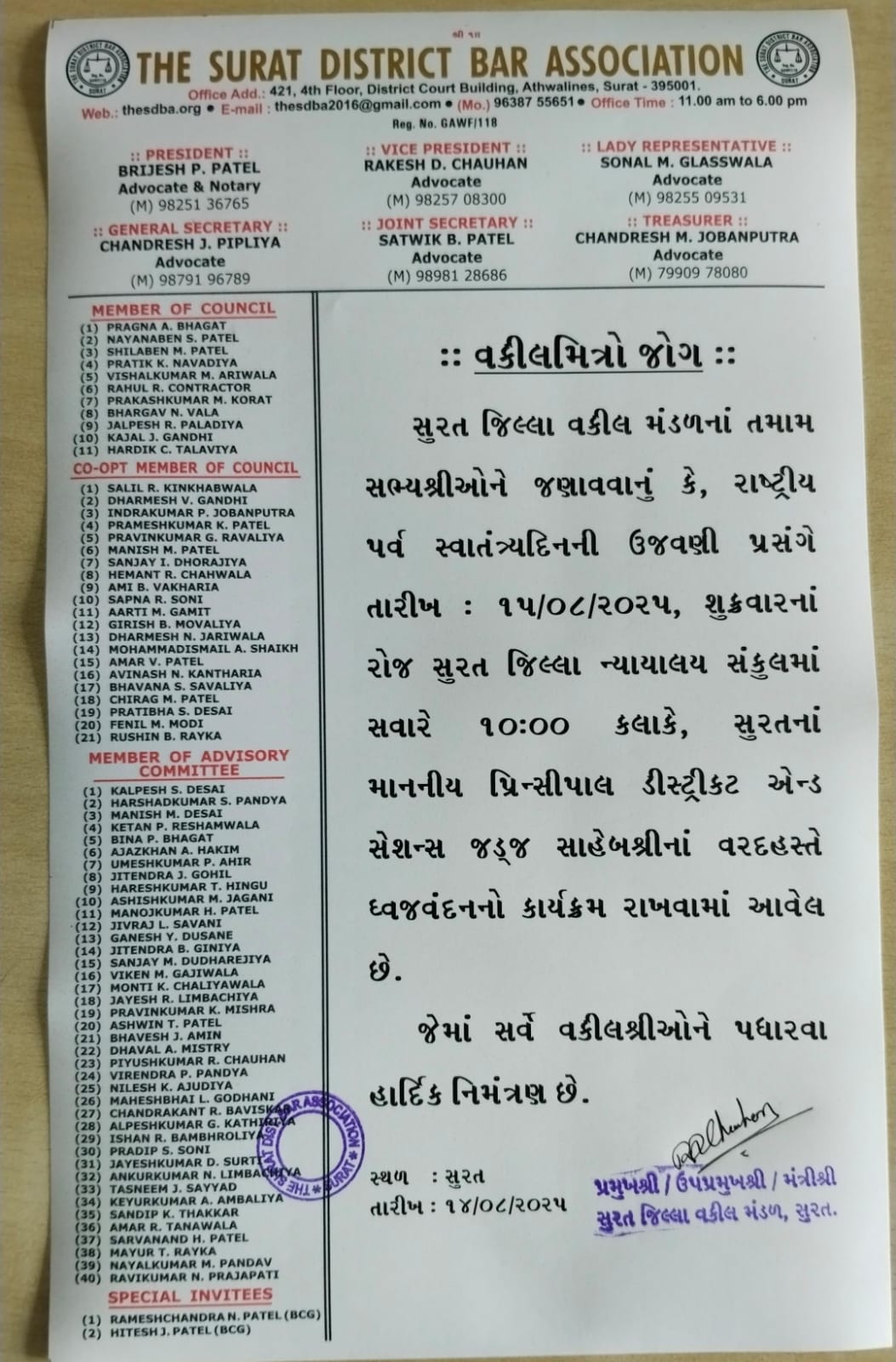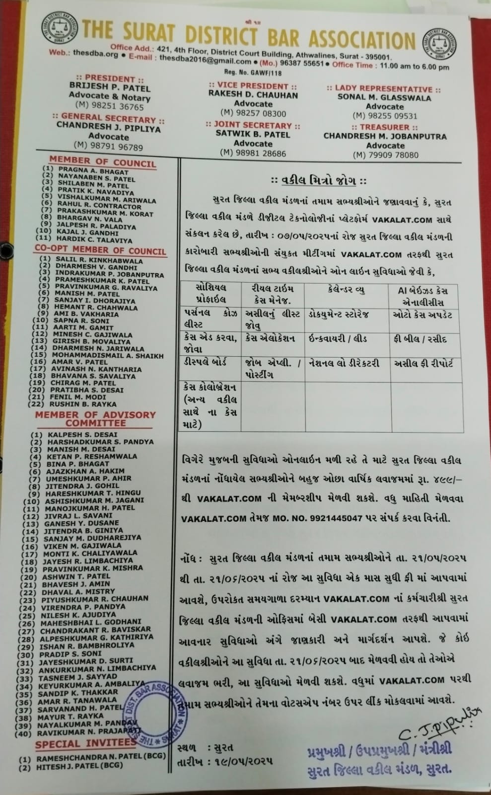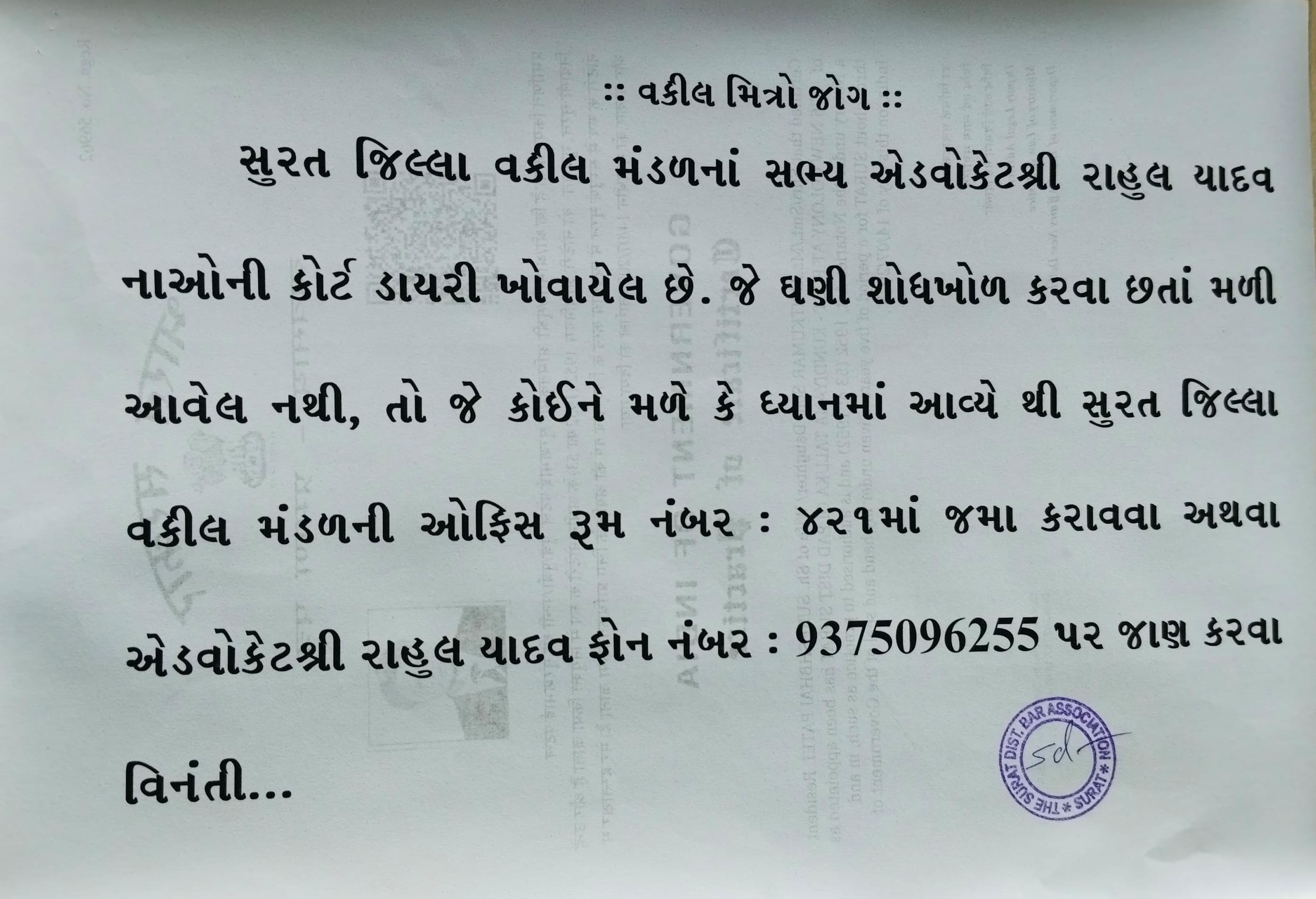 સુરત જિલ્લા વકીલ મંડળનાં તમામ વકીલશ્રીઓને જણાવવાનુંકે,