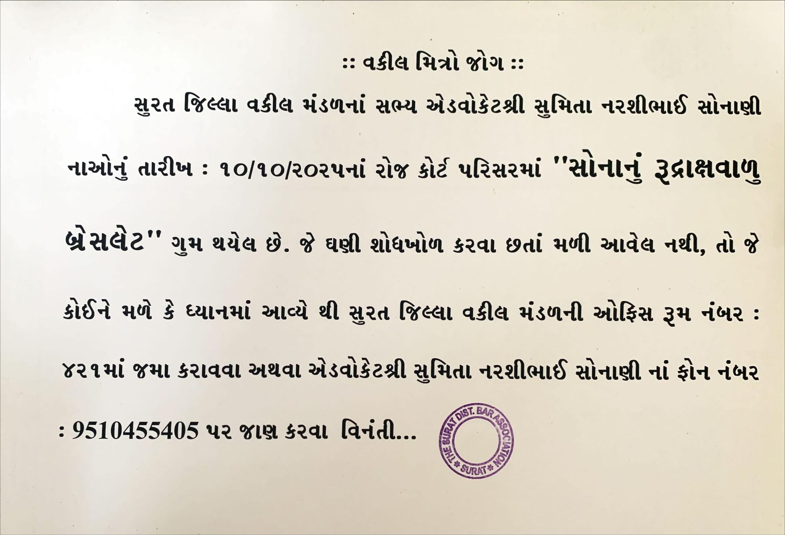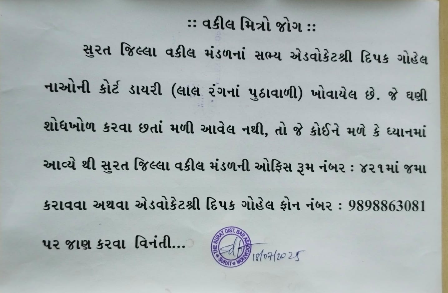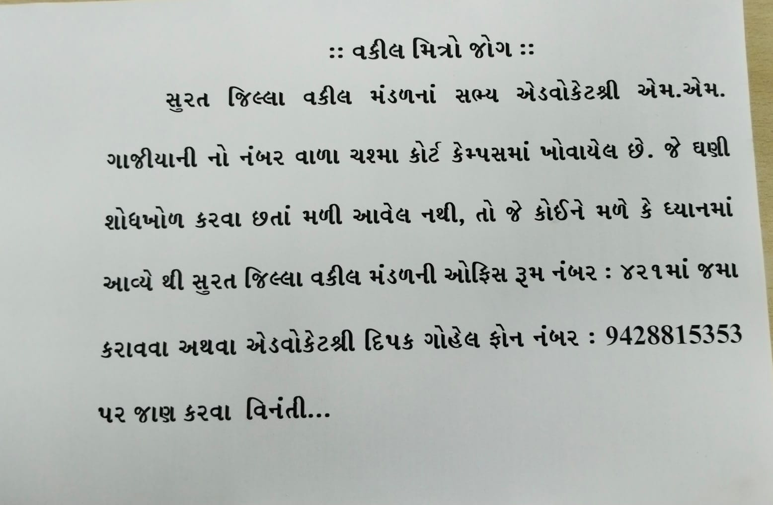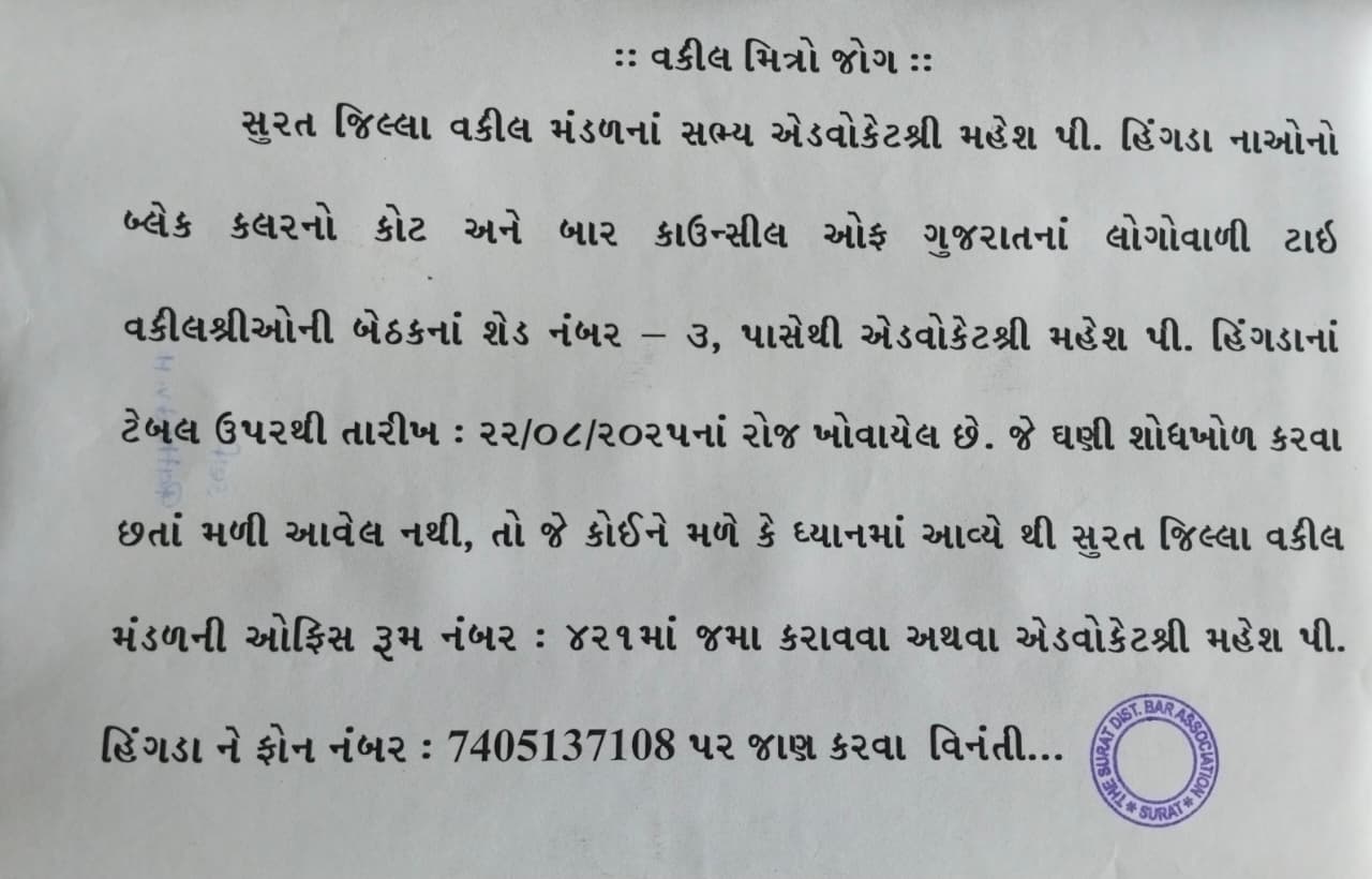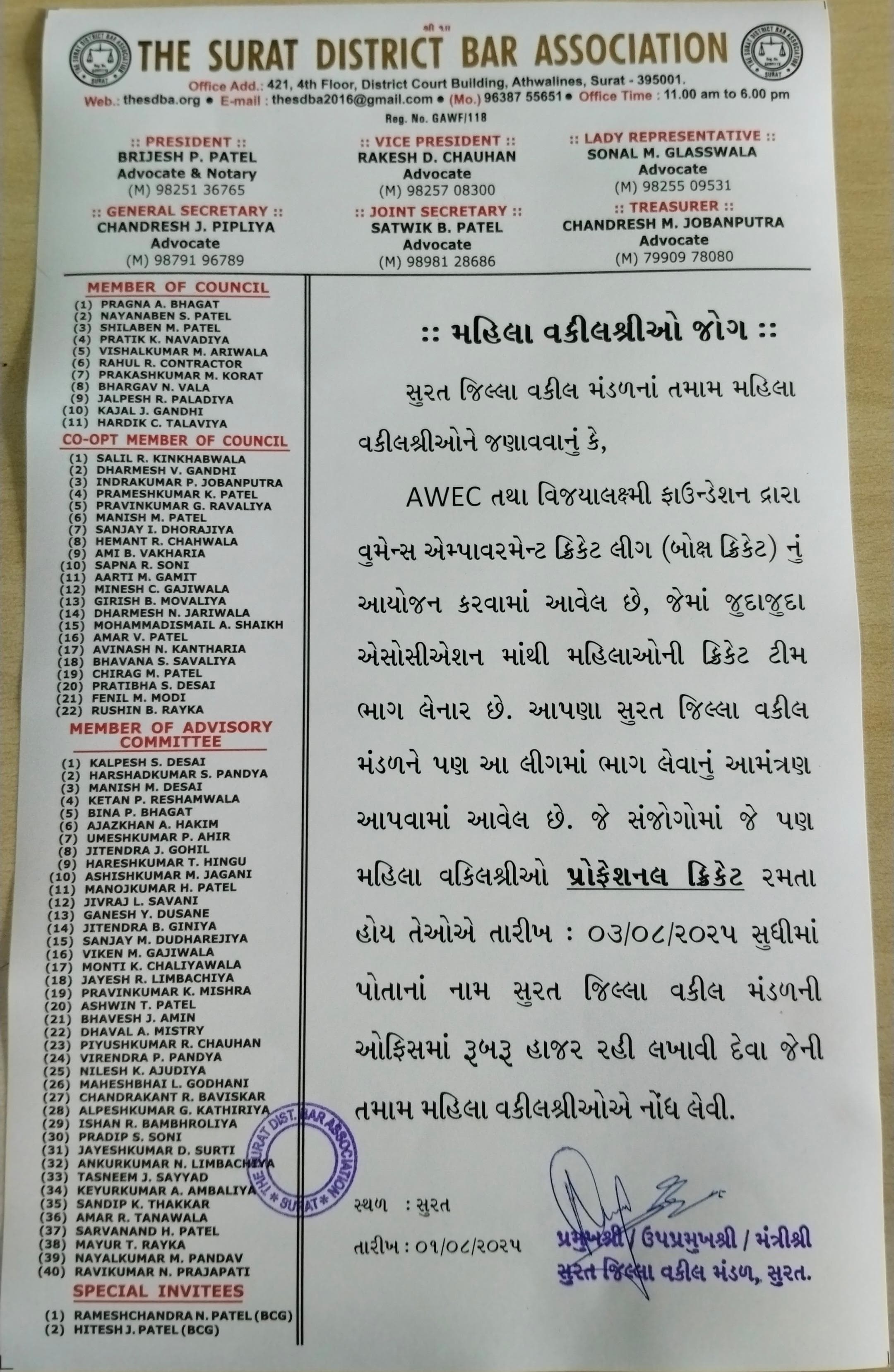 સુરત જિલ્લા વકીલ મંડળનાં તમામ વકીલશ્રીઓને જણાવવાનુંકે,