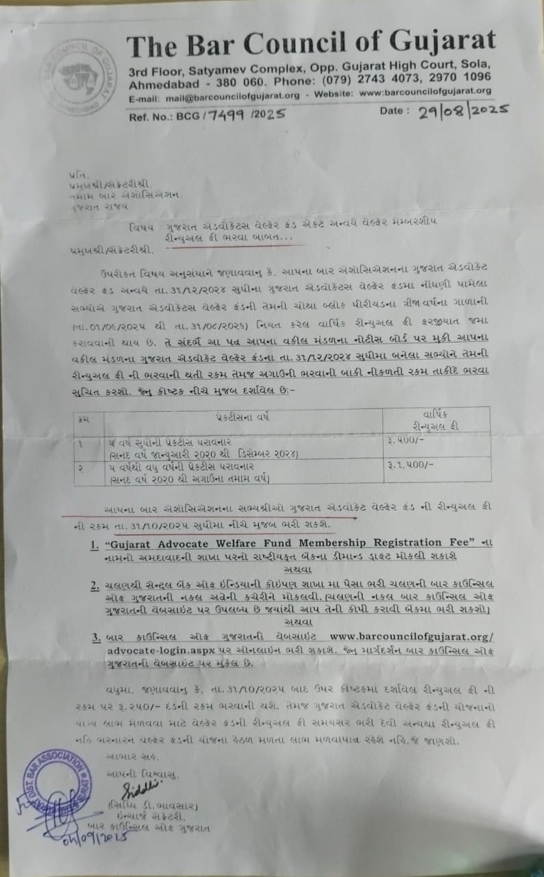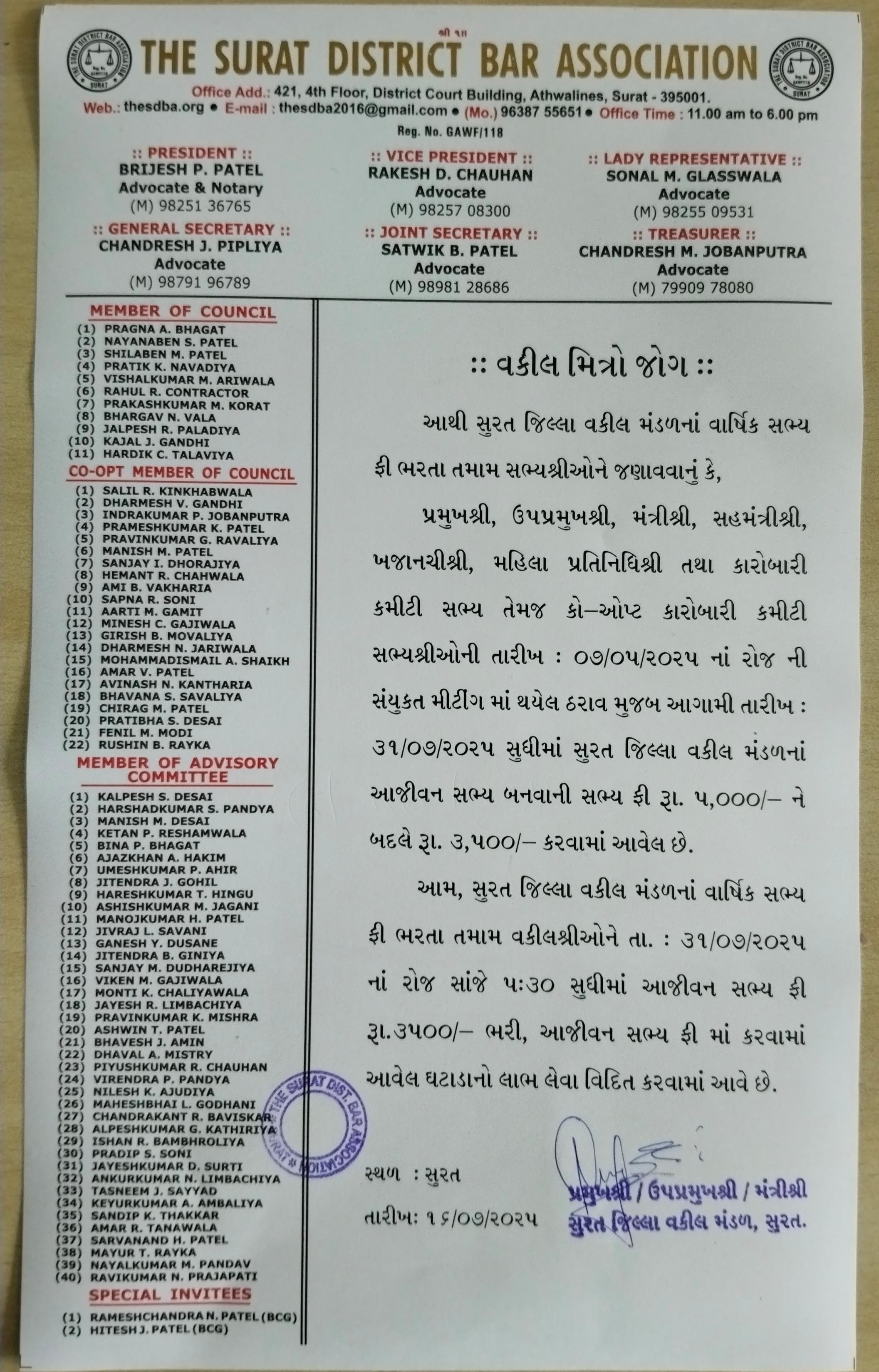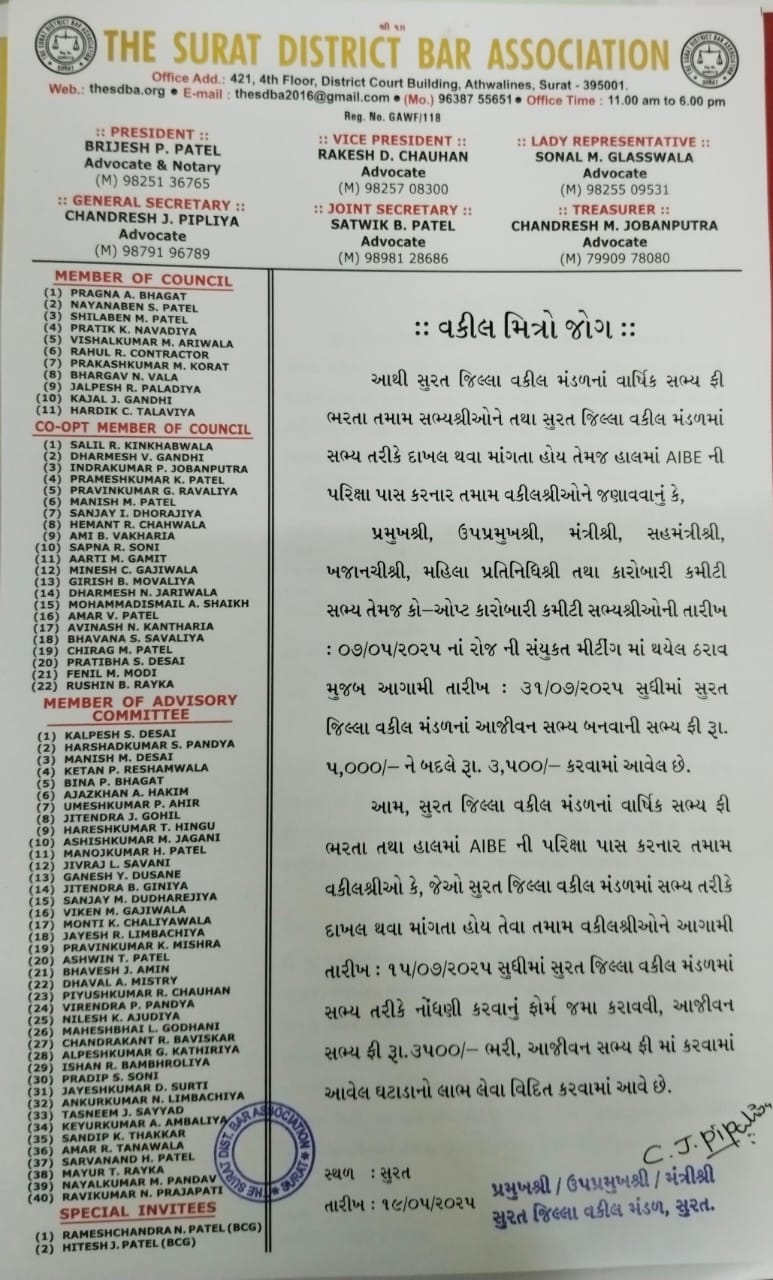 આથી સુરત જિલ્લા વકીલ મંડળના વાર્ષિક સભ્ય ફી ભરતા તમામ સભ્યશ્રીઓને તથા જેઓ સુરત જિલ્લા વકીલ મંડળમાં સભ્ય તરીકે દાખલ થવા માંગતા હોય તેઓને જણાવવાનુંકે તારીખ : ૨૮/૦૪/૨૦૨૨ ના રોજ મળેલ કાઉન્સીલ સભ્યોની મિટિંગમાં થયેલ ઠરાવ મુજબ તારીખ : ૦૨/૦૫/૨૦૨૨ થી તારીખ: ૦૨/૦૬/૨૦૨૨ સુધીમાં આજીવન સભ્ય ફી રૂ. ૫૦૦૦/- ને બદલે રૂ. ૩૫૦૦/- ભરીને આજીવન સભ્ય બની શકે છે.જે સર્વે ને વિદિત થાય.