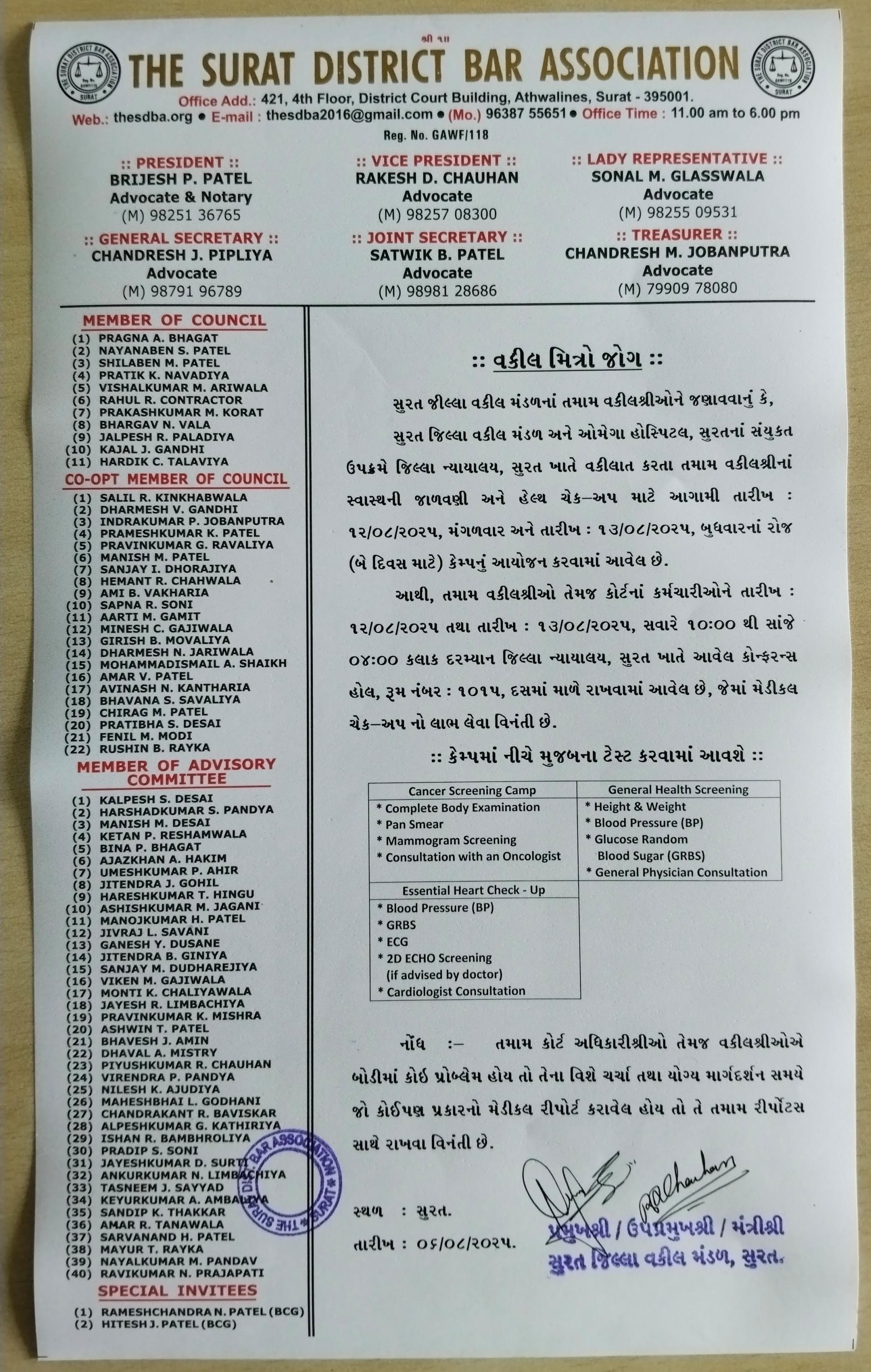આથી સુરત જીલ્લા વકીલ મંડળના તમામ સભ્યશ્રીઓને જણાવવાનુંકે, સેલ્બી મલ્ટી સ્પેશીયાલિટી હોસ્પિટલ તથા સુરત જીલ્લા વકીલ મંડળના સંયુક્ત ઉપક્રમે તારીખ : ૨૧/૧૨/૨૦૨૧ નાં રોજ સવારે ૧૧:૦૦ થી બપોરે ૦૪:૦૦ કલાક દરમ્યાન દસમો માળ, કોન્ફરન્સ હોલ, નવી કોર્ટ, બિલ્ડીંગ, અઠવાલાઇન્સ, સુરત ખાતે જનરલ મેડિકલ હેલ્થ ચેક- અપ (બ્લડપ્રેશર, જનરલ સુગર, ઓર્થોપેડિક સર્જન, જનરલ ફિઝીશિયન ) વિગેરેના સ્પેશીયાલિસ્ટ ડોકટરશ્રીઓ હાજર રહી નિઃશુલ્ક સેવા આપવાના હોય, જેથી તેમની સેવાનો લાભ સુરત જીલ્લા ના જ્યુડીશ્યલ ઓફિસર્સ, તમામ વકીલશ્રીઓ તથા કોર્ટ કર્મચારીગણોને અચુક લાભ લેવા જાહેર અપીલ છે.