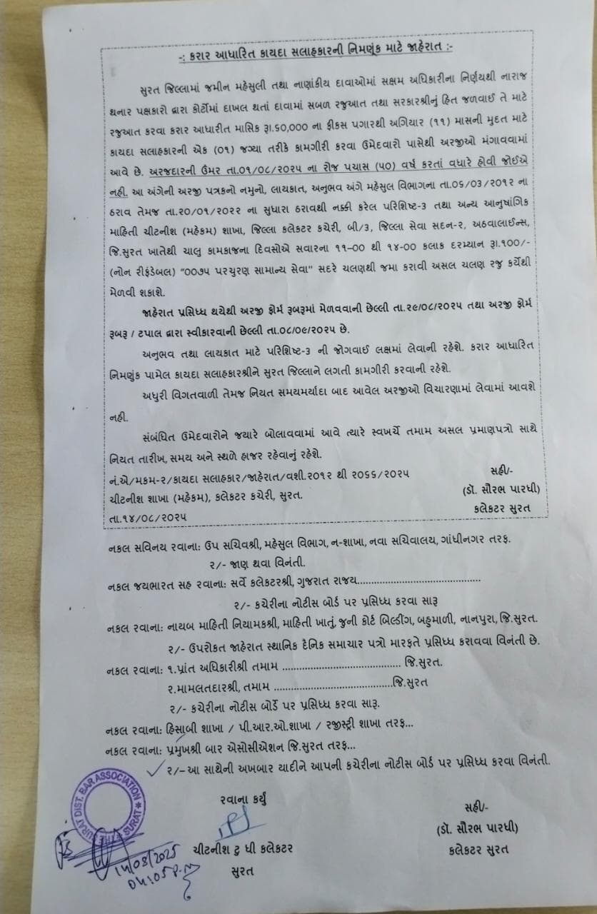 Advertisement for empanelment of advocate for district legal services authority, Surat and taluka legal service committees, Choryasi, Bardoli, Kathor, Mandvi, Mangrol, Mahuva, Palsana, Olpad, Umarpada . Application form is attached with advertisement.