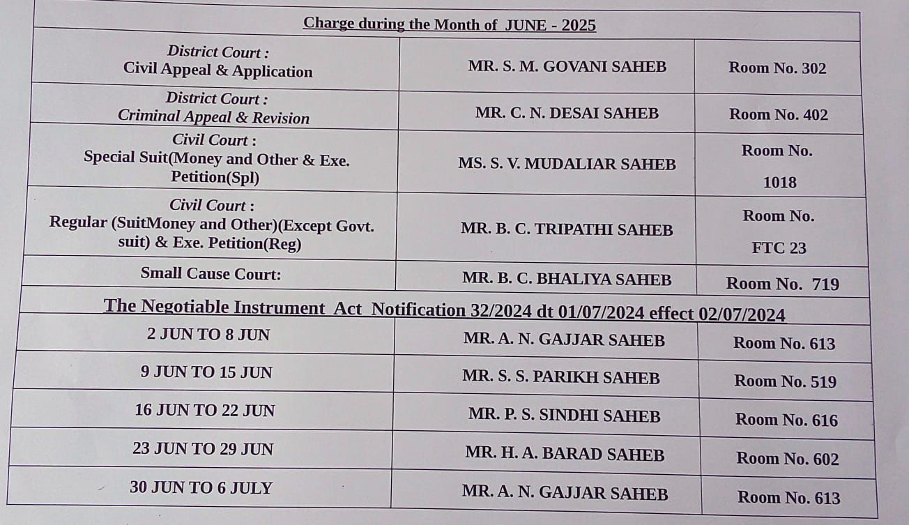 વિષય : નોવેલ કોરોના વાઇરસ ના ચેપને નિયંત્રણમાં રાખવાના કારણોસર ઉદભવેલ પરિસ્થિતિને અનુસંધાને કેસ બોર્ડ કેન્સલ કરવા તથા યથાવત પરિસ્થિતિ જાળવી રાખવાના મનાઈ હુકમની તારીખ લંબાવવા બાબત. હાલની કોરોના વાઇરસના ચેપની પરિસ્થિતિને ધ્યાને લેતા, અત્રે સમક્ષના તમામ જિલ્લાના કેસની સુનાવણી તા. ૧૫/૦૨/૨૦૨૨ સુધી મુલત્વી રાખવામા આવે છે. અરજદરના હિતને નુકશાન ન થાય તથા અન્ય વિપરીત પરિસ્થિતિ ન સર્જાય તે હેતુસર અત્રેની દાખલ થયેલ રિવીઝન અરજીના કામે આપવામાં આવેલ યથાવત પરિસ્થિતિ જાળવી રાખવા બાબતના મનાઈ હુકમ તા. ૧૫/૦૨/૨૦૨૨ સુધી લંબાવવામાં આવે છે. જે અંગે સંબધિત તમામ પક્ષકારો તથા મુલાકાતીઓ તથા વકીલશ્રીઓએ નોંધ લેવા વિનંતી છે